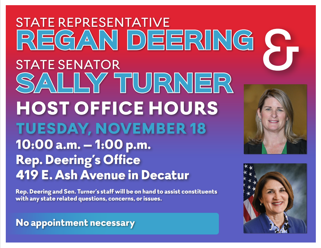Please join State Senator Sally Turner’s and my staff for office hours on Tuesday, November 18th from 10am-1pm at my district office, 419 E. Ash Ave, in Decatur. Our teams…